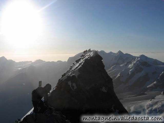 | Andra in obliquo verso destra e vincere le placche successive (altra corda fissa di 15 mt.) che portano alla "Scala Jordan", scala di corda e pioli in legno che permette di superare un tratto strapiombante in grande esposizione (traballante); subito dopo vi e' un'altra corda che aiuta a superare una placca liscia e porta ad una cengia (Gite Wentworth) per poi ritornare in cresta. Da qui si superano ancora due tratti attrezzati e per una stretta cengia e facili roccette si guadagna la vetta italiana (mt. 4.476) 4 h dalla cap. Carrel. Scendere sull'aerea e innevata cresta sommitale e raggiungere la croce e per chi vuole proseguire a pochi metri, sempre sul filo, di cresta si trova la vetta svizzera, 2 metri piu' alta di quella italiana. Il panorama e' mozzafiato, fanno impressione la ripida parete nord e il fatto di avere il vuoto totale attorno a se, ma è ancor più' grande la soddisfazione di aver conquistato la vetta del Cervino. Discesa: (piu' delicata della salita) ripercorre l'itinerario di salita; oppure si puo' scendere dal versante svizzero e ritornare poi in Italia con gli impianti o a piedi. |