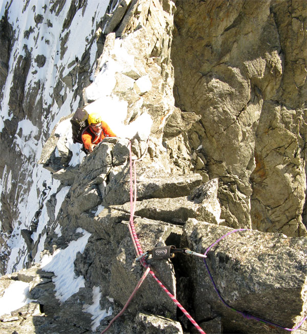 Qui si alterna un tratto (2 tiri di corda) su neve, un tiro su roccia per uscire lungo la cresta della Punta Young lato nord, un corto tirello su roccia/neve fino all'intaglio per la doppia.