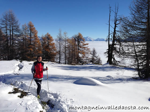 Mont Emilius, dopo questo breve attimo di bosco diradato, si rientra nel bosco seguendo un lungo traverso verso destra