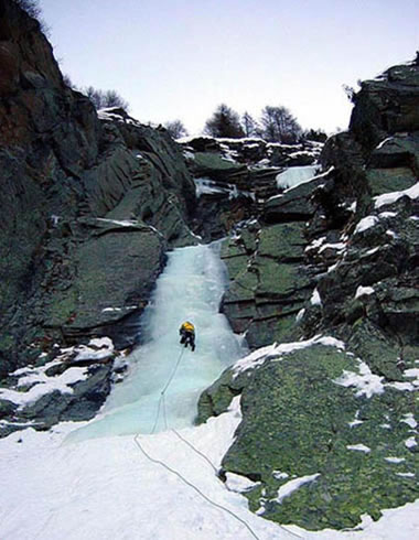 Quota base della cascata: 1.900 mt. Dal campeggio seguire la pista di fondo che s'inoltra nella Valeille, poco prima del ponte salire a sinistra il pendio che porta alla visibile colata. Attaccare il canale iniziale con pendenze 70°- 75° costanti, uscire a sinistra e sostare sulle rocce (spit). Con una diagonale portarsi a destra, superare un muretto a 80° e sostare dietro la candela (spit). |