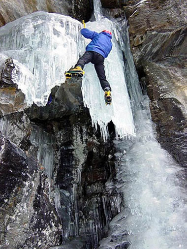 Protezioni su spit e chiodi da ghiaccio, sosta su albero.