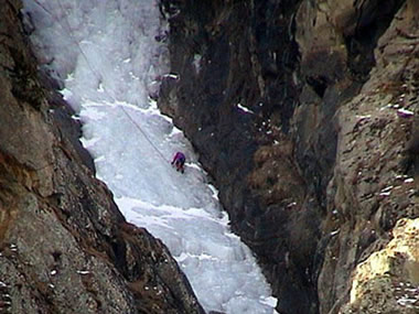 Difficoltà: II 4+ Da Aosta proseguire sulla S.S. per il Monte Bianco e all'altezza di Villeneuve svoltare per la Valsavarenche; superare Dejoz e giungere poco dopo la partenza per il Rifugio Chabod (2 km prima di Pont) e sulla destra e' visibile la cascata. Risalire la colata fino a trovare sulla destra la prima sosta a spit. Discesa: con doppie sulla cascata oppure raggiungere la sterrata del Nivolet e ridiscendere verso Pont e poi sulla strada raggiungere l'auto. |