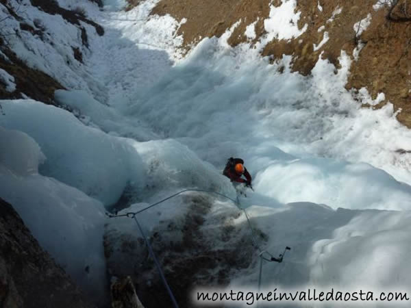 Cascata ancora in ottime condizioni con ghiaccio abbondante, un po' secco e spaccoso sul primo tiro, migliore in seguito.