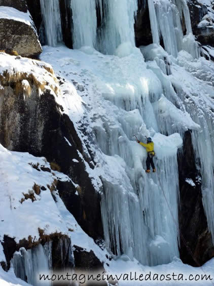 L1. si supera un primo muro verticale sulla sinistra (3 m a 90°, in apertura ghiaccio fine), al termine del quale, per