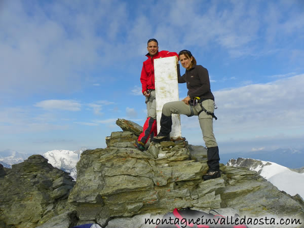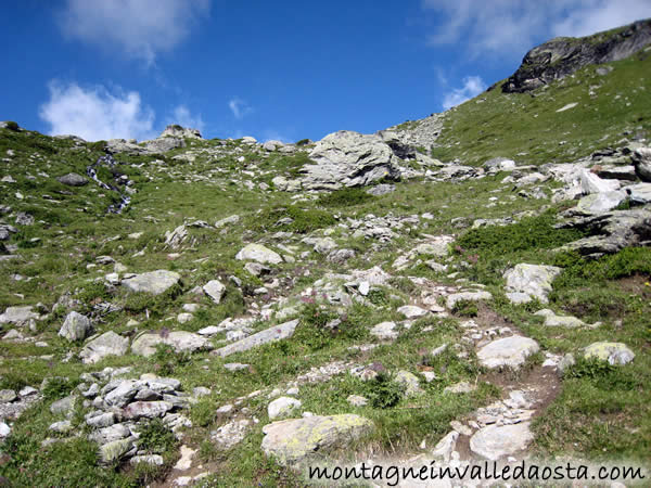| Oltre l'alpeggio la salita si fa più impegnativa. Si risale un pendio tra erba e pietre fino ad arrivare al Plan du Brei. Qui per un breve tratto, il sentiero spiana un po' e ci consente di riposare, ma ben presto ci si trova sotto il pendio finale per l'ultimo lungo sforzo. A tornanti, sempre su sentiero segnato, si sale inizialmente un tratto erboso fino ad arrivare ad un altro piccolo punto di sosta. Da qui la pendenza aumenta ancora e il percorso è tra le rocce con tratti su neve anche a stagione inoltrata. E' anche la parte più bella e selvaggia dell'escursione, col terreno e il paesaggio che cambiano in continuazione. Non vi è nulla di difficile nella salita, non ci sono nemmeno tratti attrezzati. |